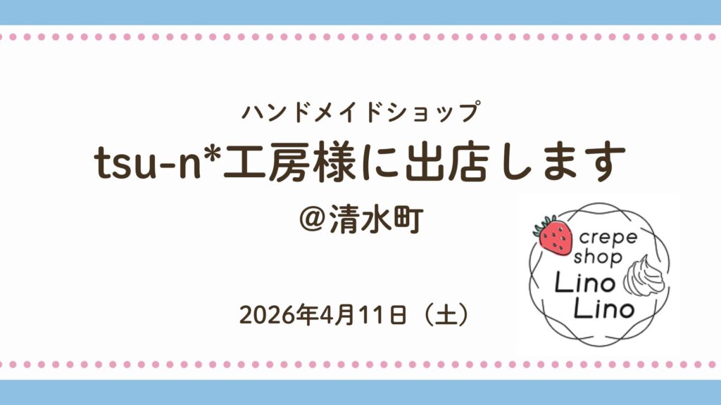 2026年4月11日(土)イベント出店情報 出店:クレープLinoLino クレープを販売いたします^^ 会場:ハンドメイドショップtsu-n*工房 411-0917 駿東郡清水町徳倉60-7 クレープLinoLinoのInstagram